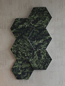Honey print is a playful wall absorbent with beehive-shaped panels in three different thicknesses that together create an effective 3D feeling in the room. Honey print is available in several stylish patterns inspired by nature.