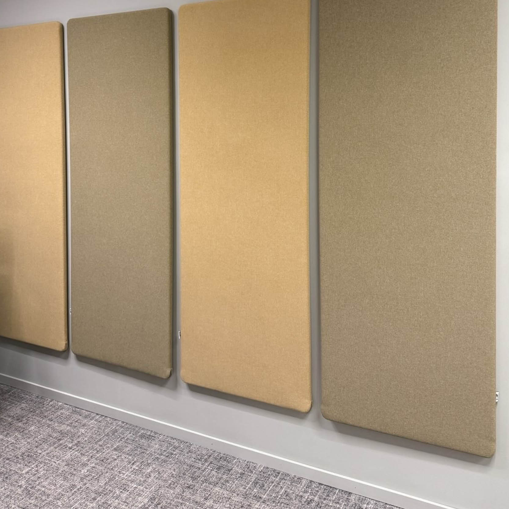 The former desk screens were taken care of by Götessons and reupholstered with new fabric. Instead of being reinstalled at the desks, they were mounted vertically and horizontally on the wall as sound absorbers using a suspension rail. In this way, existing products could be reused while also contributing to improved acoustics in the new work environments.