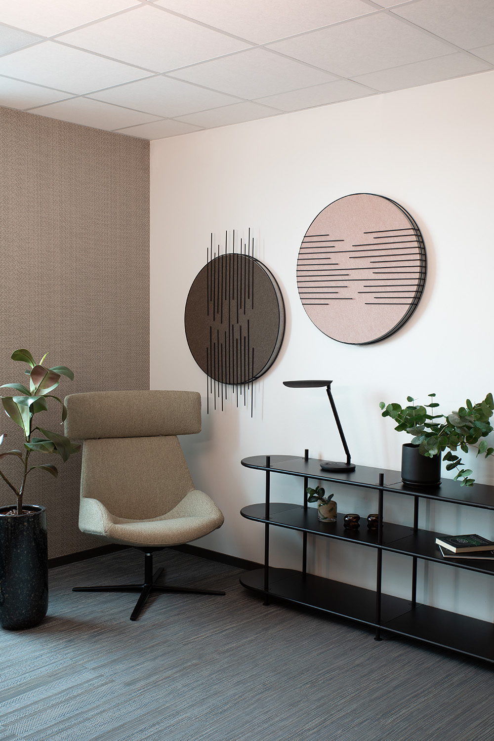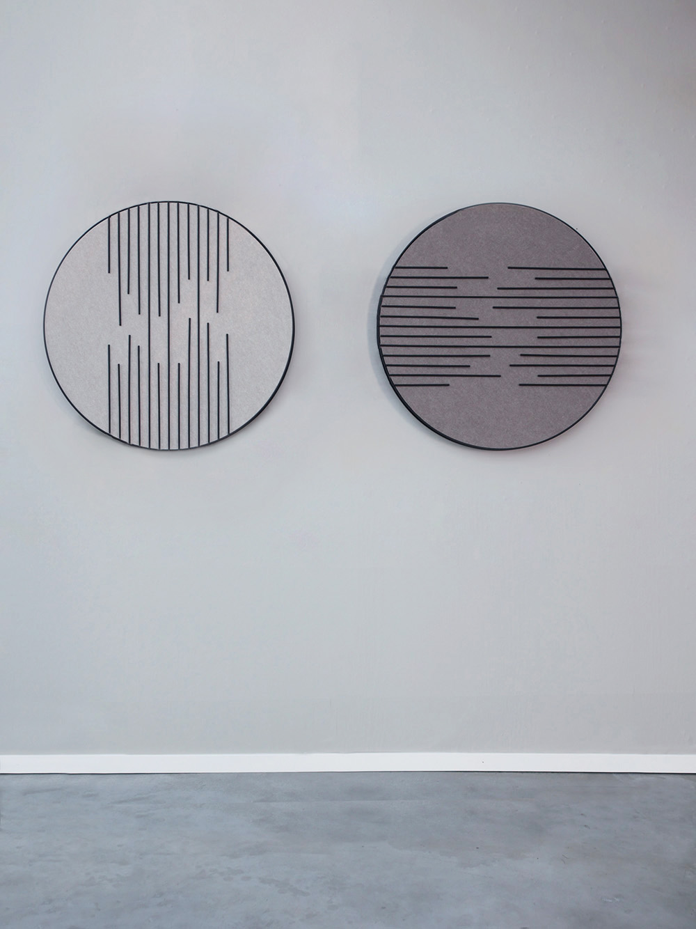 Lasi is an additional variant of wire mesh for ceiling absorbers. Here, the metal wires are gathered on the inside of the circle into a soft and pleasant pattern.