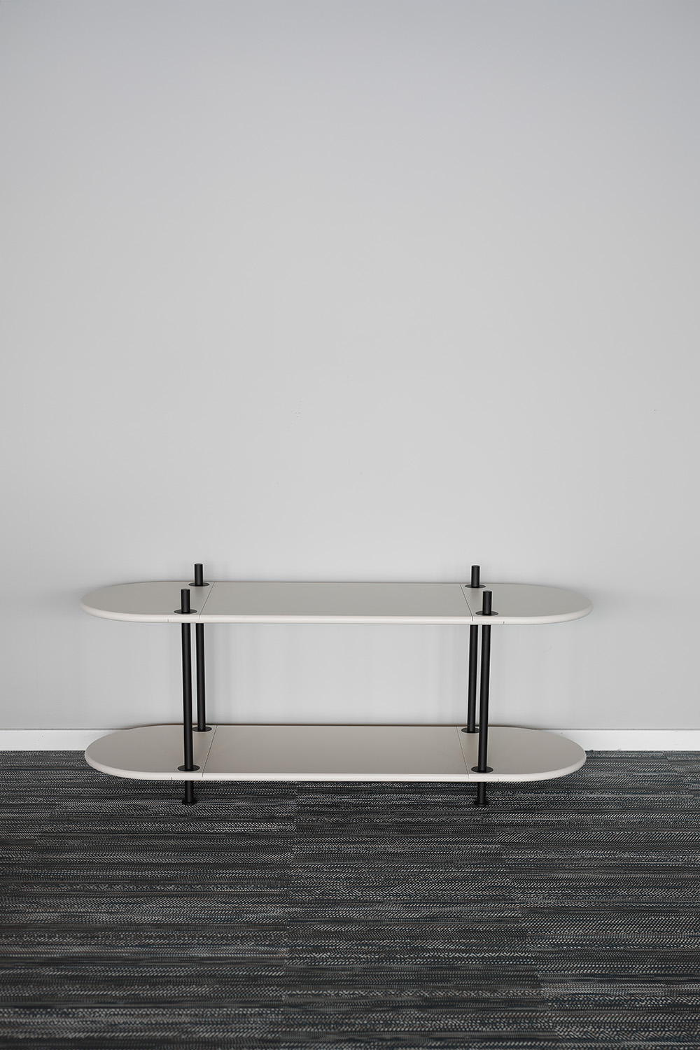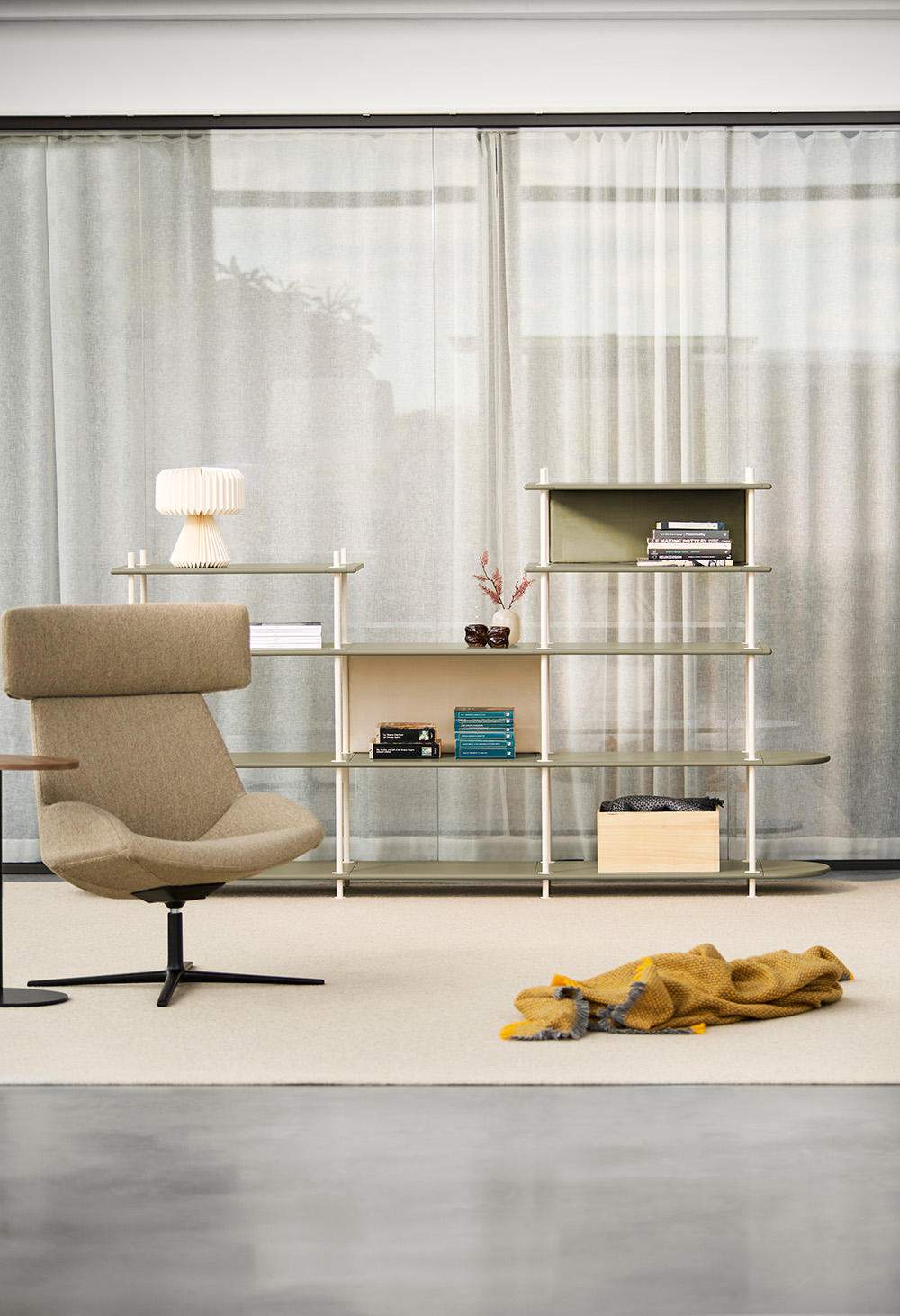 A combined storage and partition unit that is quick and easy to assemble — entirely without tools. This modular shelving system is ideal for open-plan offices and works perfectly next to individual workstations. Rods and shelves come in a range of colours, and the look can be customised by choosing between rounded or straight end pieces. Adding screens enhances both partitioning and sound absorption, and they simply click into place using hidden magnets. Designer: Stringdahl & HATT.