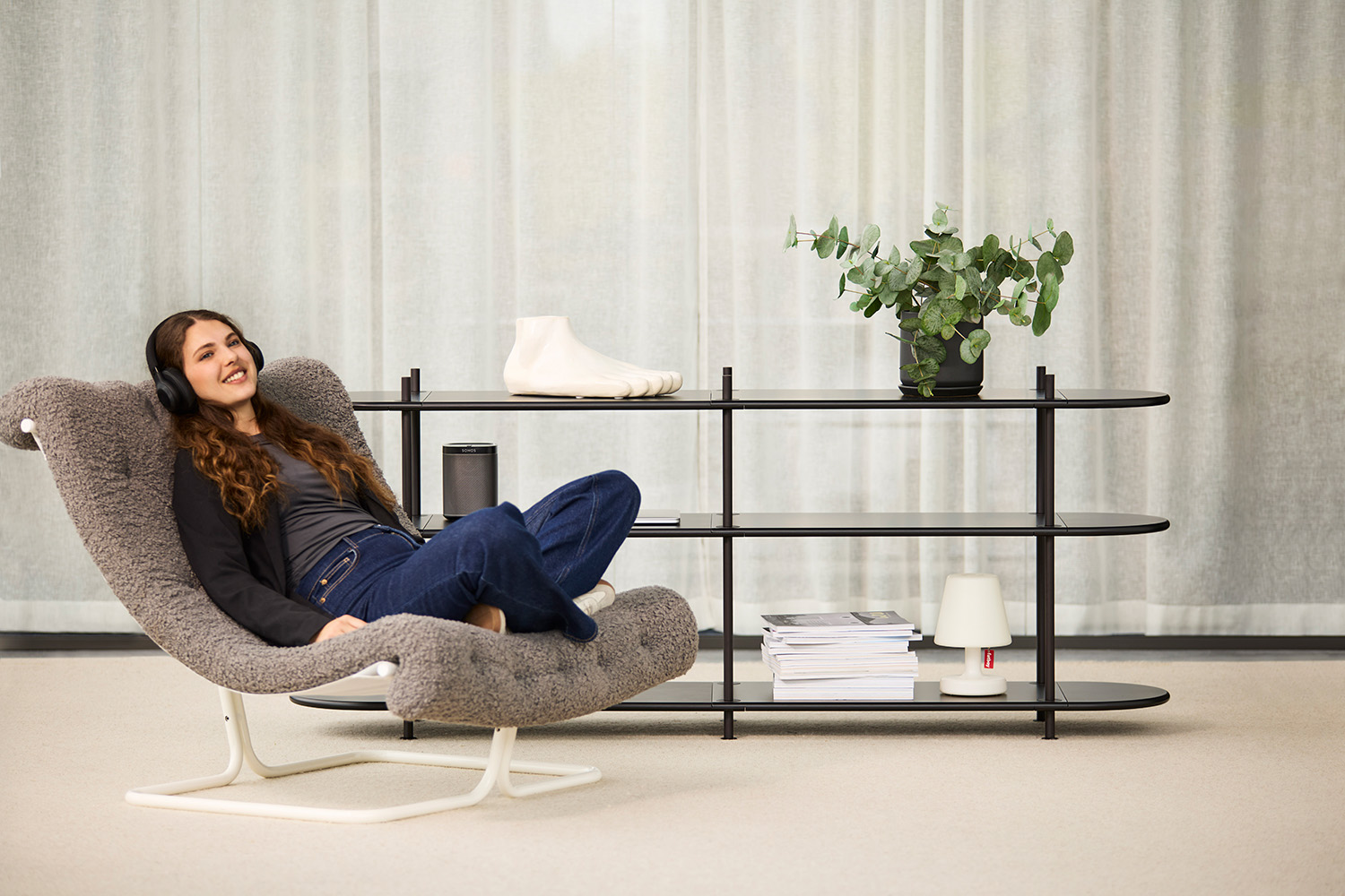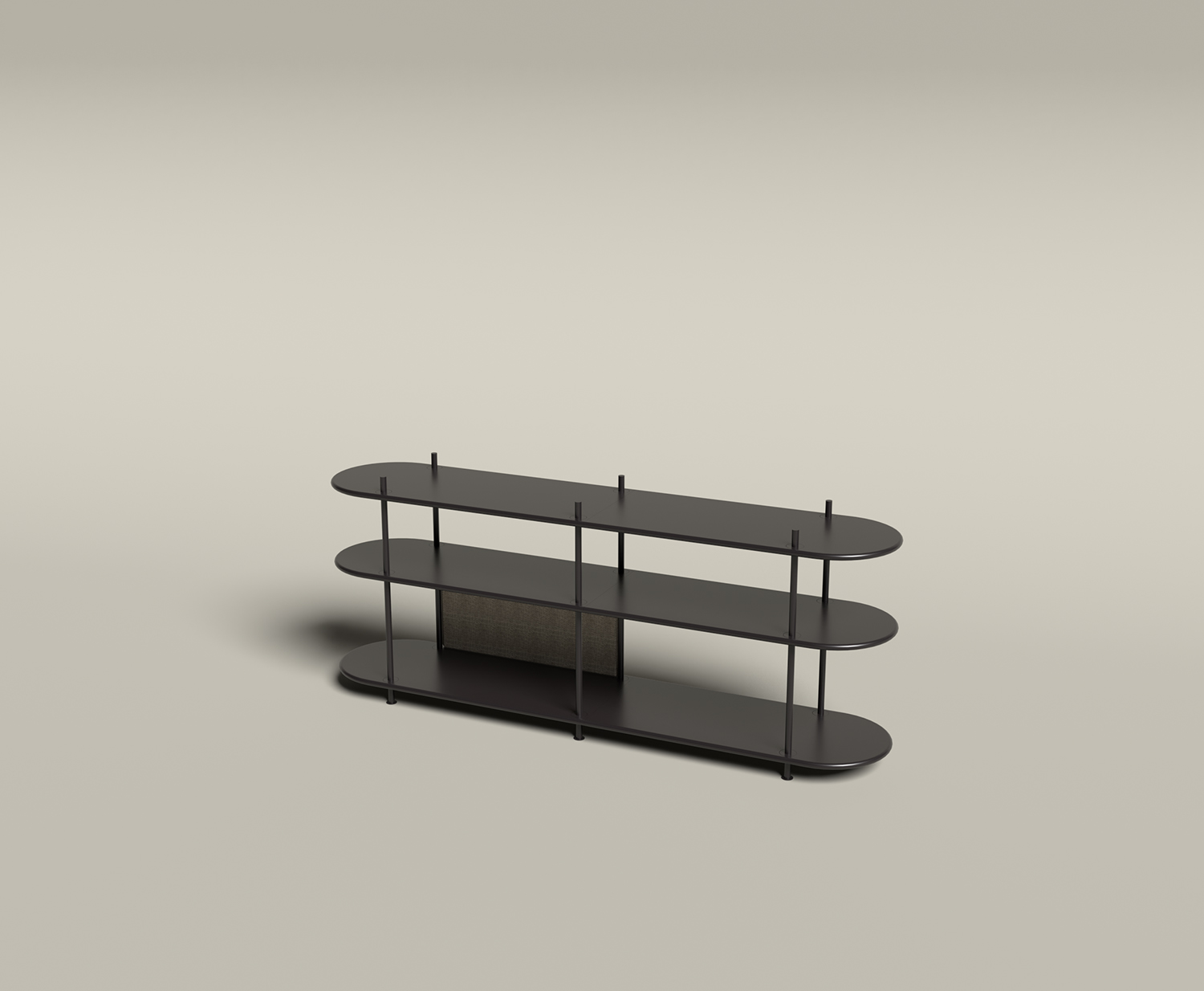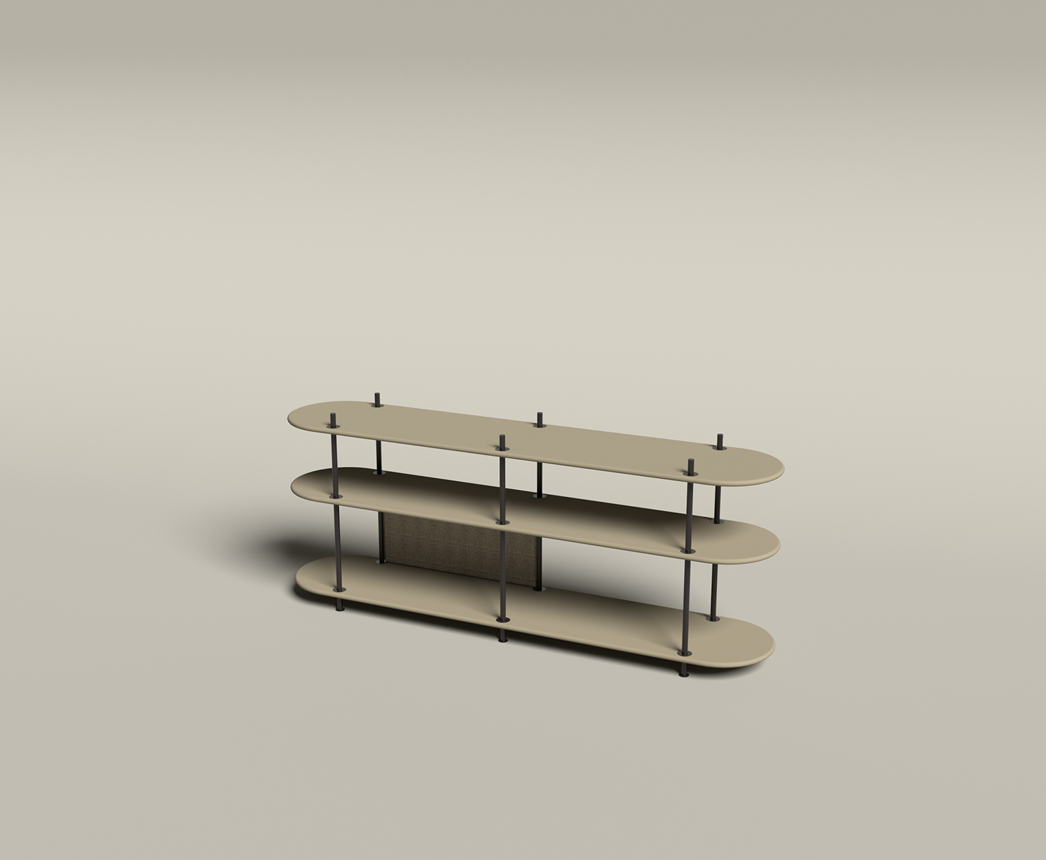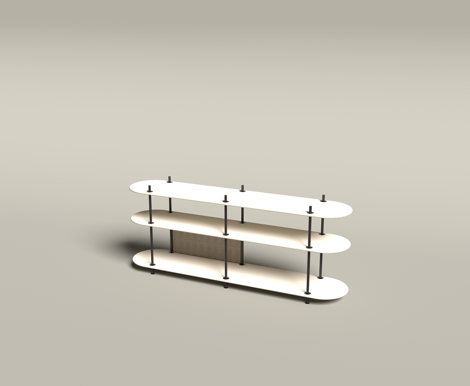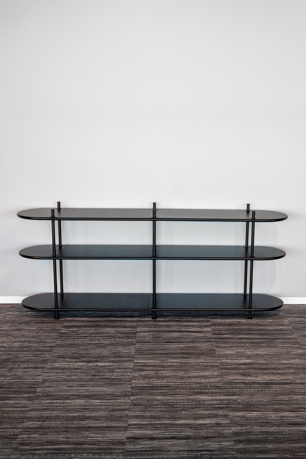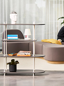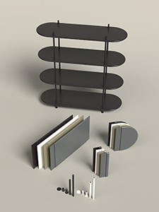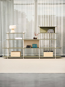 A combined storage and partition furniture piece that is easily assembled using different modules. Entirely tool-free assembly. This is a pre-configured combination called Wing Consol, but you choose the colour of the rods and shelves.