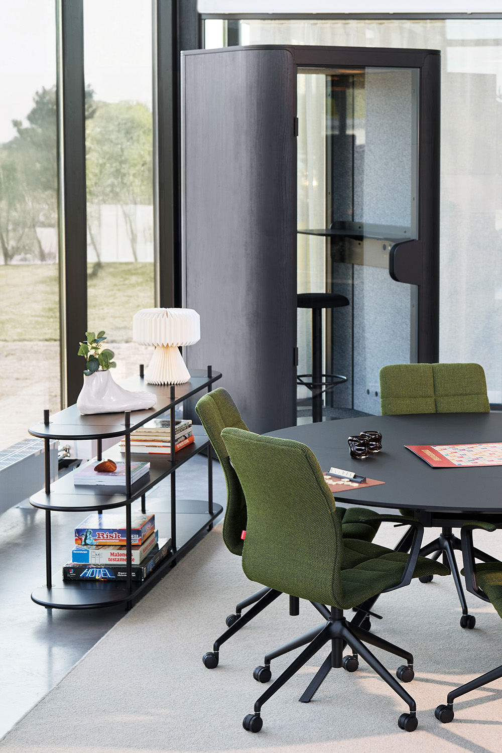 By adding screens, the unit provides even greater partitioning and sound-absorbing effects. The screens are easily clicked into place with hidden magnets. Designers: Stringdahl & HATT.