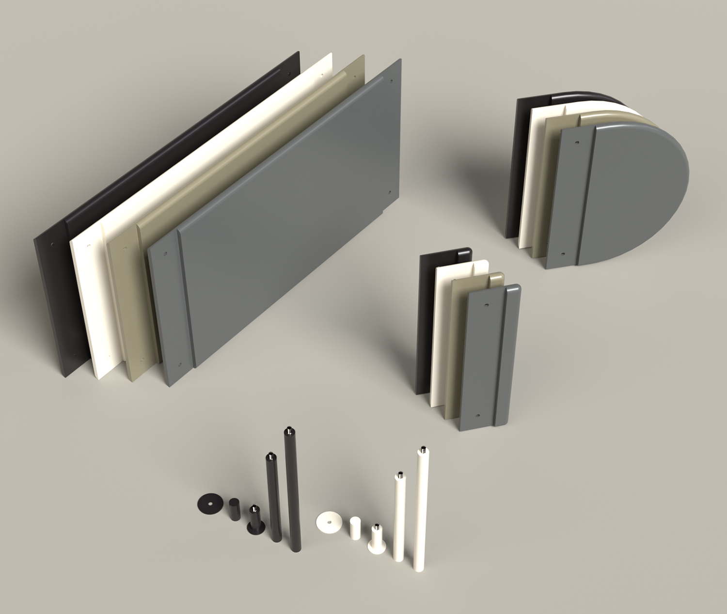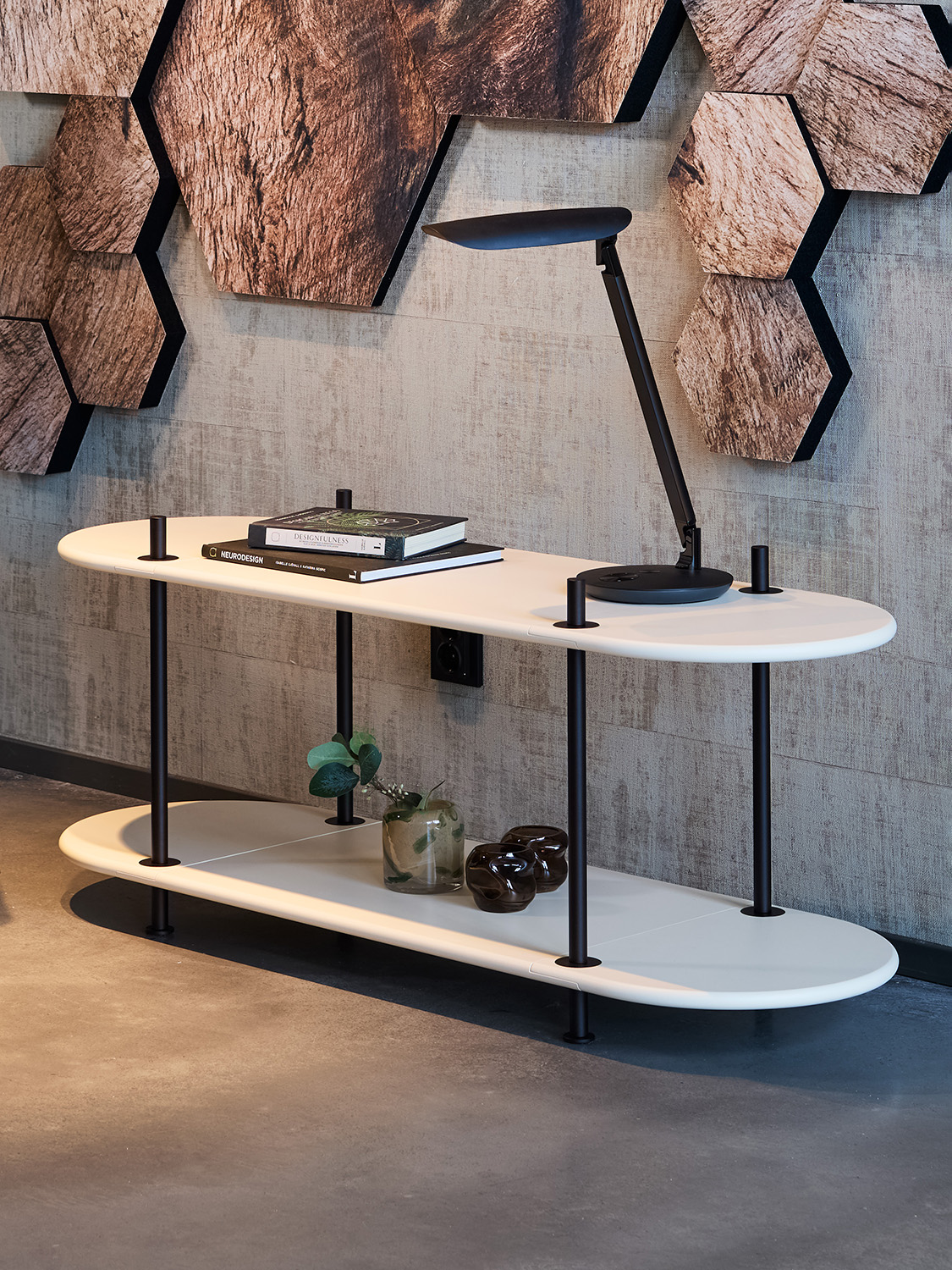 A combined storage and partition unit that is quick and easy to assemble — entirely without tools. This modular shelving system is ideal for open-plan offices and works perfectly next to individual workstations. Rods and shelves come in a range of colours, and the look can be customised by choosing between rounded or straight end pieces. Adding screens enhances both partitioning and sound absorption, and they simply click into place using hidden magnets. Designer: Stringdahl & HATT.