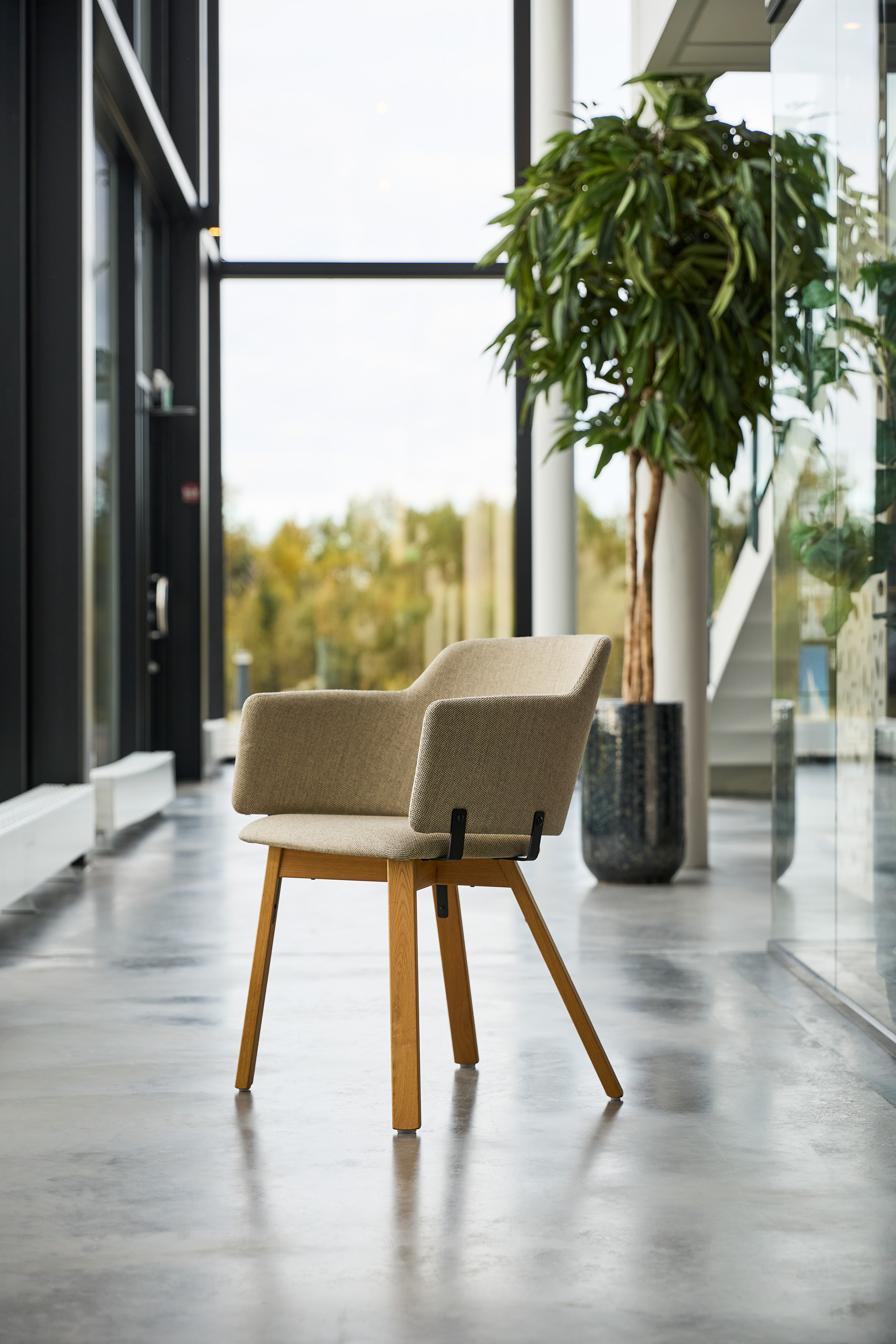 Une chaise élégante et confortable avec un piètement en bois massif qui s’adapte à la plupart des intérieurs. Les accoudoirs sont suffisamment hauts pour assurer votre confort et votre sécurité, tout en vous permettant de glisser le fauteuil sous la plupart des plateaux de table. Skift est conçu pour les utilisations les plus intensives, avec un cadre en bois moulé au niveau de l’assise et du dossier/des accoudoirs. L’espace entre l’assise et le dossier et l’assise pleine facilitent le nettoyage et permettent de refaire l’habillage de chaque élément. La chaise Skift Plus bois peut être utilisée seule, ou avec d’autres chaises dans une salle de conférence ou une salle à manger.
