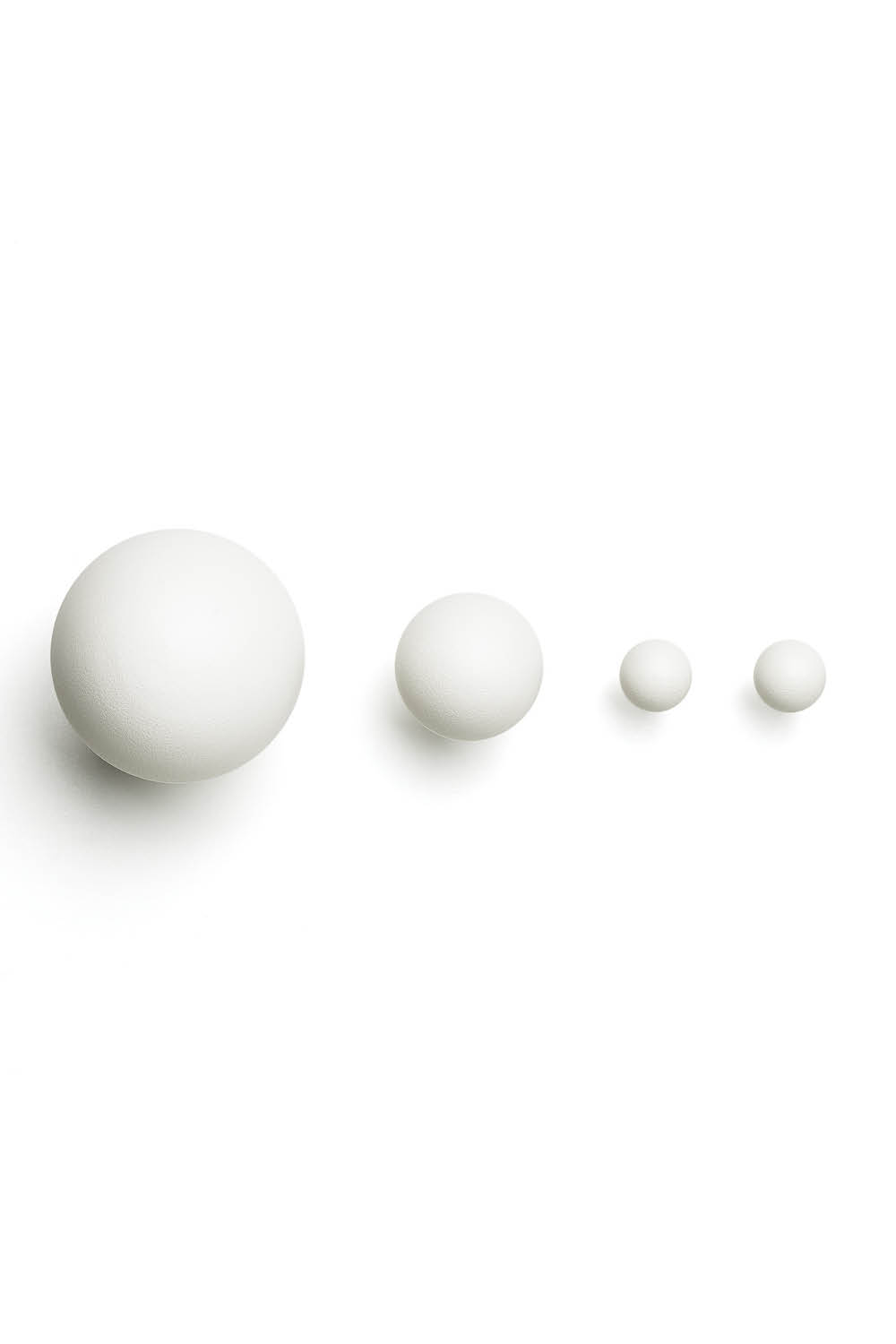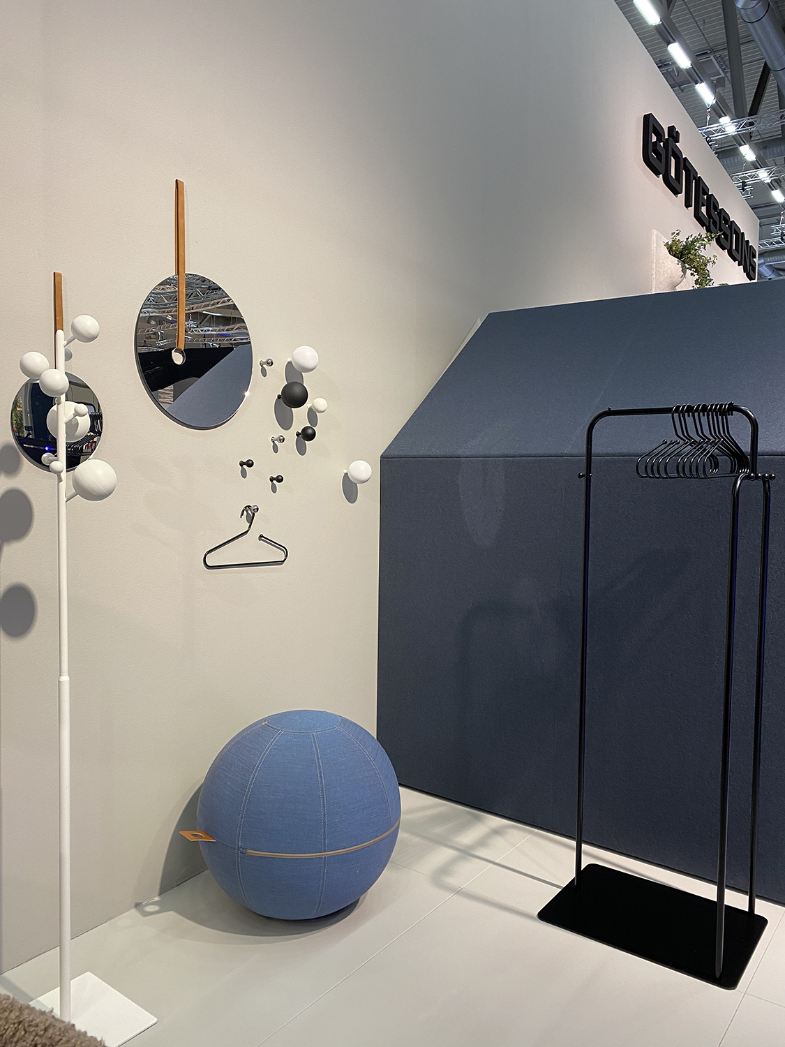 Veggmonterte runde metallkuler. Med avstand fra veggen blir det plass til både klær og kleshengere. De gir til og med en fantastisk skygge når de er opplyst.