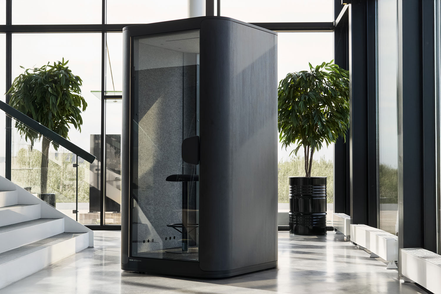 Casa Uno er utformet som en tradisjonell telefonkiosk, der du kan arbeide uforstyrret eller ha fortrolige telefonsamtaler. Den inneholder et fast bord til PC, strømuttak, ladeporter, behagelig, dimbar belysning og en valgfri barstol. Båsen er dessuten utstyrt med automatisk ventilasjon, noe som gir et sunt inneklima. Design o4i Designstudio.