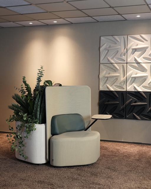 Klädda pallar på kontoret som fungerar som extra sittplats till besökare och förvaring. Soffor som bildar en lugn ljudabsorberande sittplats och en avgränsning i kontorslandskapet. Sköna loungemöbler och sittmöbler för alla miljöer där kunden själv enkelt kan förändra och bygga nya kreativa rum.
