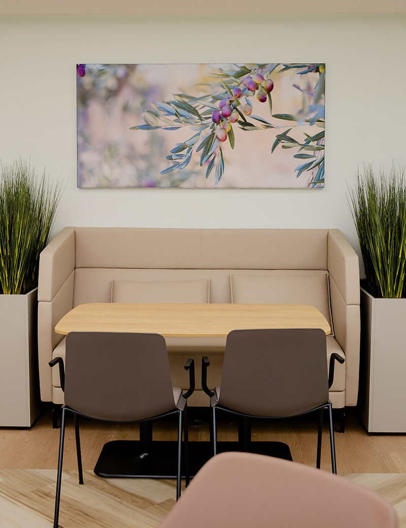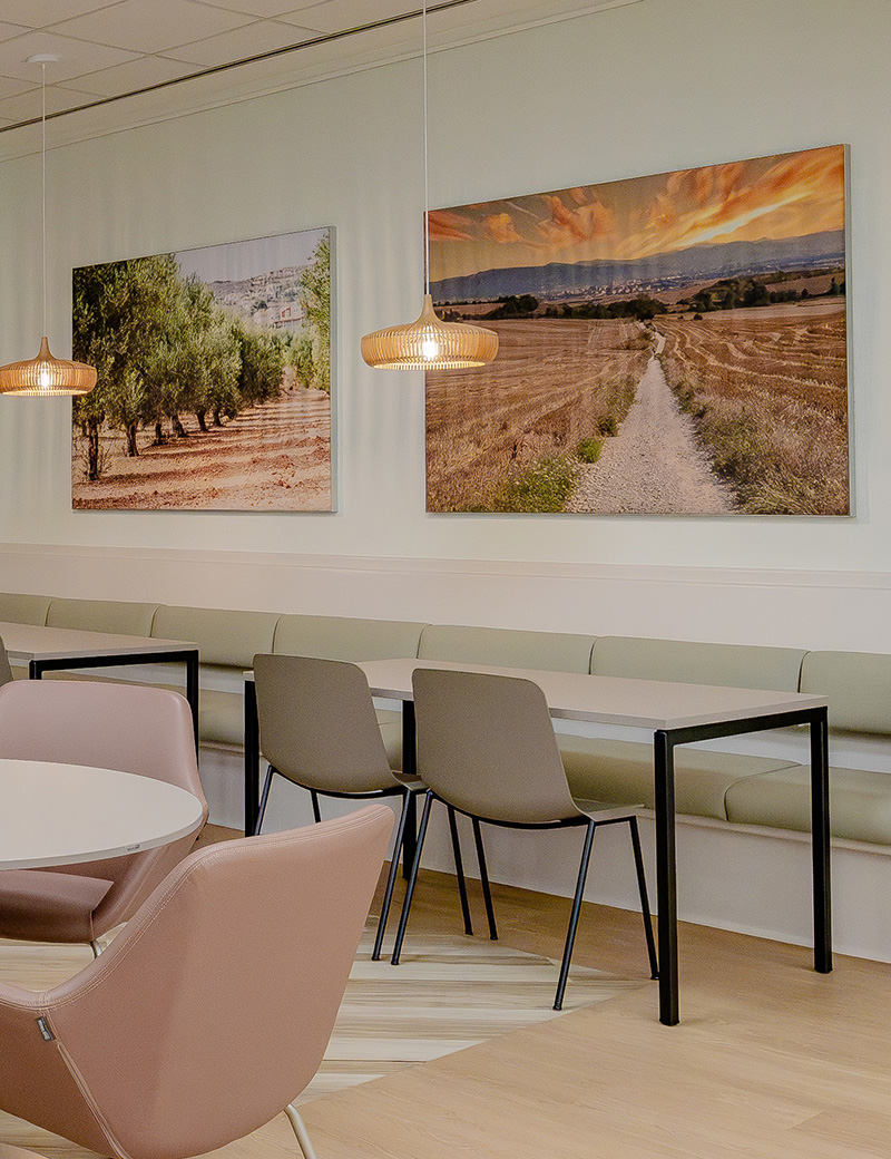 Tillsammans med Götessons har personalutrymmena fått en ny, mjukare karaktär där akustik, estetik och funktion samverkar. Med Slice Panel, Divido och Printtavlor har ljudmiljön förbättrats samtidigt som rummen fått ett tydligt visuellt uttryck. Resultatet är sociala ytor som upplevs lugna, inbjudande och hemtrevliga, trots den intensiva vårdmiljö som omger dem.